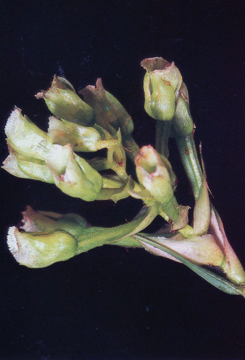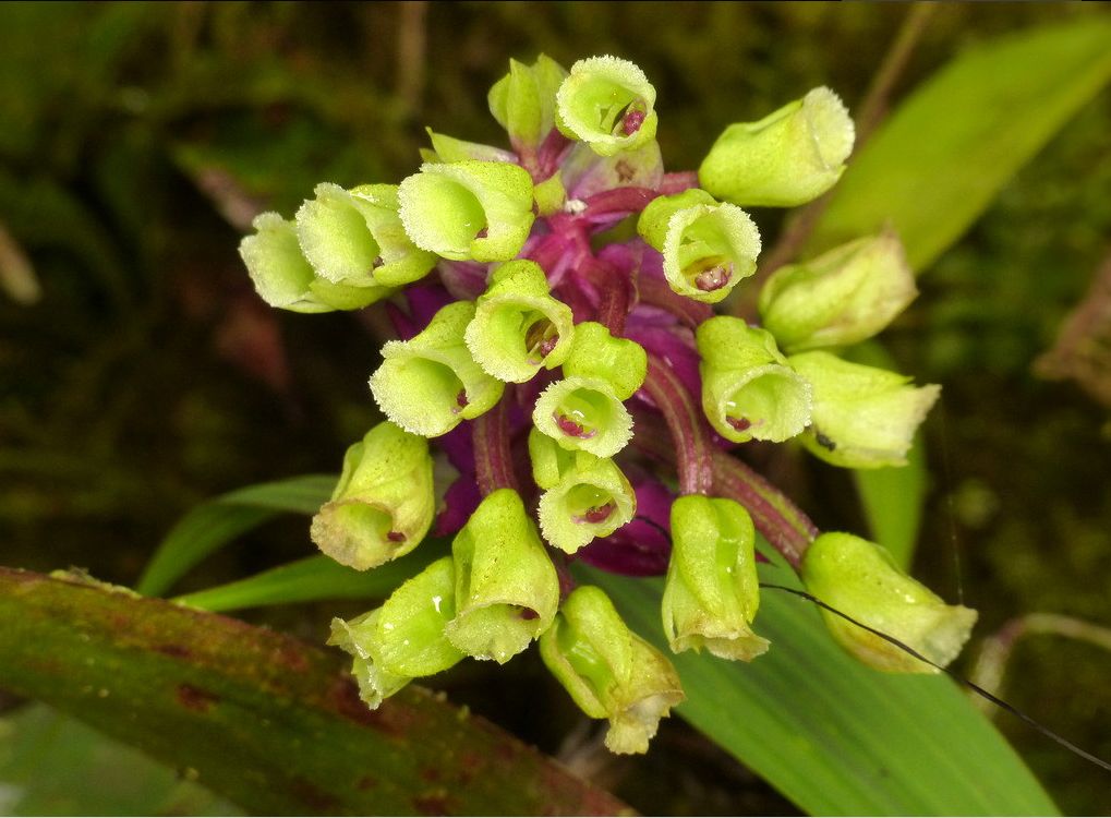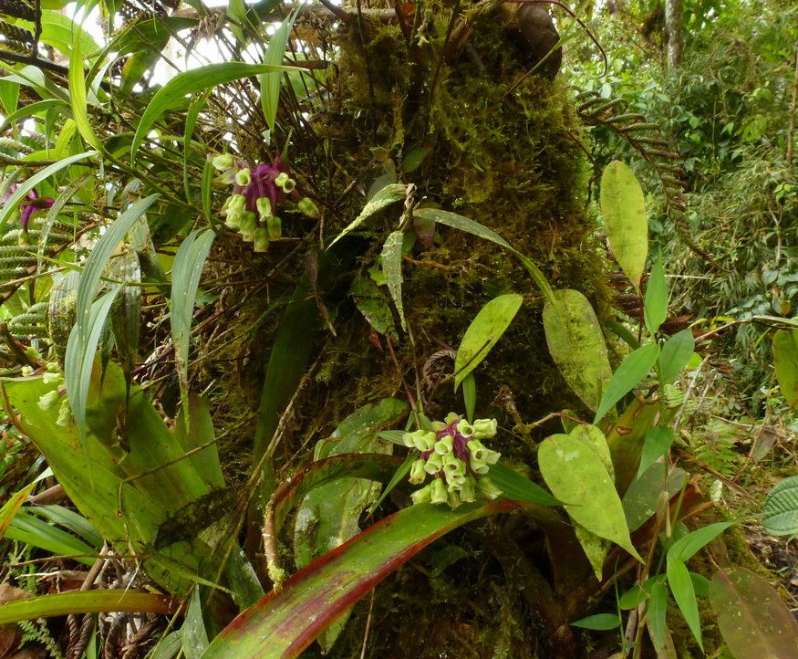 Found in Colombia and Ecuador at elevations around 1400 meters as a medium sized, cool growing terrestrial withcane-like, arcuate, elongate, slender, unbranched, basal half leafless upper half leafy stem carrying 5 to 7 or if fertile 1 to 2 reduced, or leafless stem, thin, plicate, 7 veined, disitichous, narrowly ovate, acuminate, sessile leaves that blooms in the late spring and early summer on a terminal, cylindric, subdensely many flowered inflorescence with cymbiform, acute, shortere than the ovaries, pinkish in youth, becoming green in time floral bracts .
