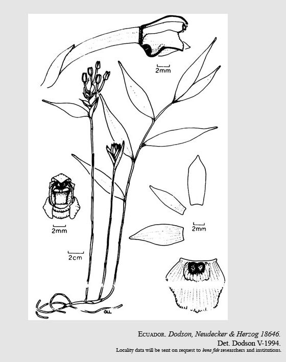 References W3 Tropicos, Kew Monocot list , IPNI ; *Orquideología Vol 19 #2 pg 134-136 Dodson 1994 Drawing good; Native Ecuadorian Orchids Vol 2 Dodson 2001 drawing/photo good; Flora of Ecuador No 87 225[3] Orchidaceae Dodson & Luer 2010 drawing good; AOS Bulletin Vol 88 # 1 2019 photo fide;