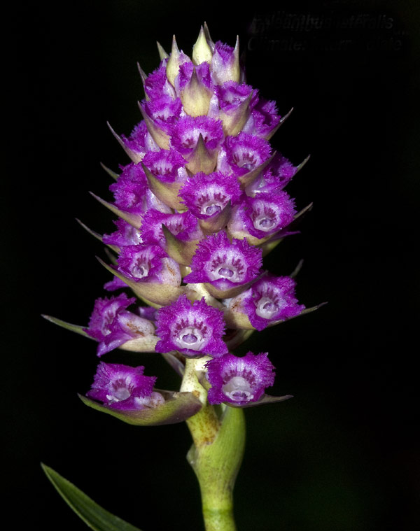 Found in eastern and southern Ecuador at elevations of 1500 to 2500 meters as a medium sized, cool to cold growing terrestrial with stiffly erect, leafy in the upper half stems carrying several, narrowly elliptic, acute, long acuminate, gradually narrowing below into the basally clasping leaves that blooms in the summer through fall on up to 4, lateral, basal, arcuate, elongate, subglobose, longer than the terminal leaf, to 5.2" [13 cm] long, subdensely several flowered inflorescence with cymbiform, acute longer than the ovaries floral bracts