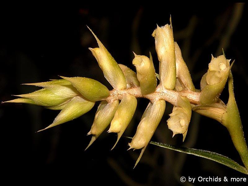Found in Costa Rica, Panama, Dominican Republic, Jamaica, Windward Islands, Guyana, Colombia, Ecuador, Peru and Bolivia in wet forests at elevations of 900 to 1100 meters as a medium sized, warm to cool growing epiphyte with erect, delicate, simple stems carrying papery, ovate-lanceolate, acuminate to long acuminate, leaves that blooms in the spring and summer on a terminal, to 3.2" [8 cm] long, densely many flowered inflorescence with yellow, narrowly triangular, acute, longer than the flowers floral bracts and carrying cream to pale yellow flowers