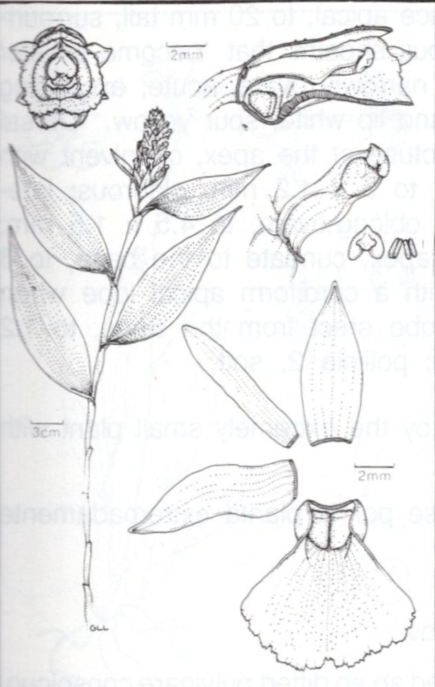 This species is distinguished with an unbranched towards the apex stem, a cone-like inflorescence with spirally arranged pale pink flowers with a brown spot on the lip apex, the corpuscules of the lip separate but close set, a well developed infrastigmatic swelling, and the column lacking a hood extending over the anther.