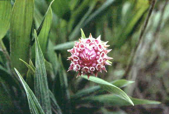 Found from Venezuela, Colombia, Ecuador, Peru and Bolivia as a small to medium sized, warm to cold growing epiphyte occuring along stream beds in rain or cloud forests at elevations of 400 to 2200 meters with an elongate, leafy stem carrying plicate, narrowly ovate-lanceolate, long-acuminate, subsessile, coriaceous, cuneate below into the base leaves that blooms in the fall on a terminal, 1" [2.5 cm] long, subcapitate, densely many flowered inflorescence subtended with ovate, subacuminate bracts that are longer than the flowers which are in a conical bunch at the apex of the cane.