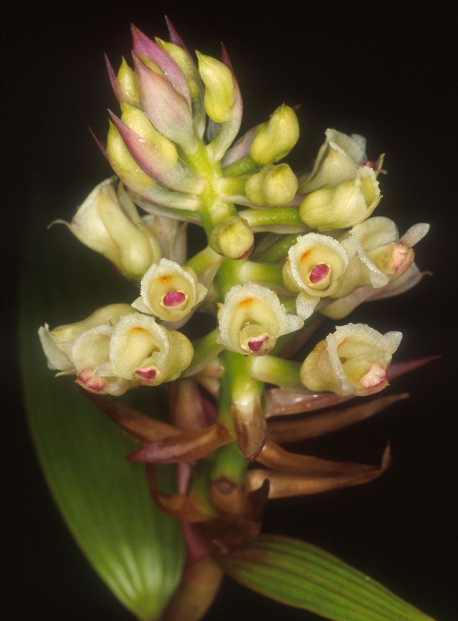 Found in Venezuela in rainforests at elevations of 1400 to 3000 meters as a robust, giant sized, cool to cold growing terrestrial with an erect stem enveloped by leaf-bearing sheaths and carrying in the apical half, several, oblong-lanceolate, acuminate-attenuate, gradually narrowing below into the cuneate base leaves that blooms in the late summer and early fall on a terminal, 2 to 4.4" [5 to 11 cm] long, cylindrical, densely many flowered inflorescence
