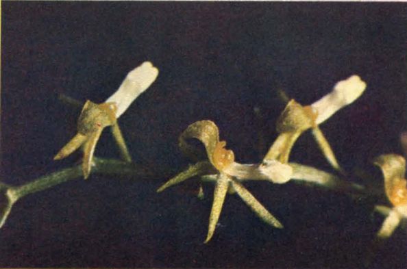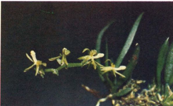 Found in Antioquia Colombia at elevations around 2000 meters as a mini-miniature sized, cool to cold growing epiphyte with a very short stem carrying sub-equitant, laterally compressed, narrow, ensiform leaves that blooms on a lateral, axillary, 1.2" 3 cm] long, few flowered inflorescence with narrowly triangular floral bracts.
