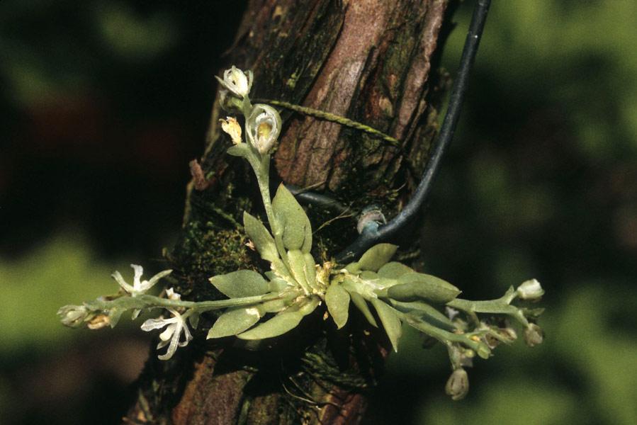 Found in Bolivia as a mini-miniature sized epiphyte with very small pseudobulb enveloped by several imbricating leaves and carrying a single apical leaf.
