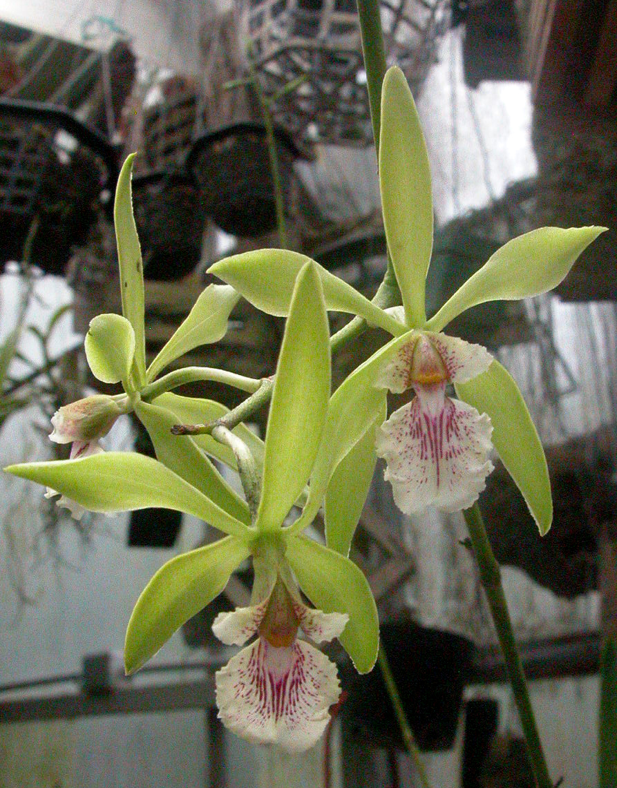 Found in Chiapas state of Mexico, and Guatemala as a medium sized, warmto cool growing epiphyte at elevations of 950 to 1875 meters and is similar in habit to Enc. alata. They have clustered, ovoid-conical pseudobulbs carrying 2 to 3 apical, linear-ligulate, acute, gradually narrowing below into the clasping base leaves. They bloom in the late spring and summer on a terminal, 3 1/2' [105 cm] long, many flowered, racemose or branched inflorescence arising on a mature pseudobulb with up to 30, lightly fragrant flowers, akin to beeswax and honey.