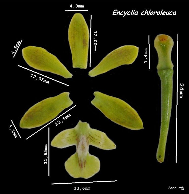 Synonyms Encyclia acuta Schlechter 1925; Encyclia chloroleuca var. rubescens Sambin & Chiron 2015; Encyclia viridiflava Menzes 1991; Epidendrum acutum (Schltr.) A.D.Hawkes 1957; Epidendrum chloranthum Lindley 1838; *Epidendrum chloroleucum Hkr. 1837; Epidendrum chloroleucum var fuscoluteum Regel 1857