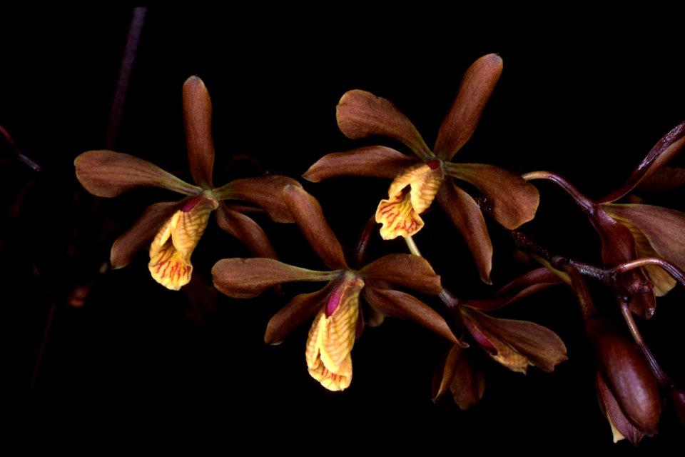 Found in Vera Cruz Mexico in oak forests at elevations of 500 to 1000 meters as a small to medium sized, warm growing epiphyte with clustered, conic-ovoid to subspherical pseudobulbs enveloped basally in youth by scarious sheaths and carrying 2, apical, elliptic, subacute, coriaceous, sometimes tinged with purple leaves that blooms in the winter through earlier spring on an erect, terminal, peduncle with scarious, tubular, pesistent bracts, laxly paniculate, 6 to 32" [15 to 80 cm] long, to 50 flowered inflorescence with scarious, triangular floral bracts and carrying sweetly fragrant flowers.