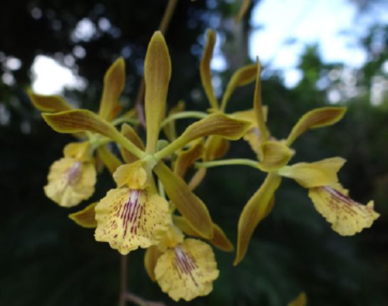 Found in westernmost Cuba at elevations of sea level to 100 meters as a medium sized, hot growing epiphyte with ovoid pseudobulbs enveloped below by evansescent sheaths and carrying 1 to 3, apical, erect, coriaceous, linear-lanceolate, acute leaves that blooms in the late spring and early summer on a terminal, erect, stout, paniculate, 22" [to 55 cm] long, to 45 flowered inflorescence with scarious, clapsing, ovate acute bracts.