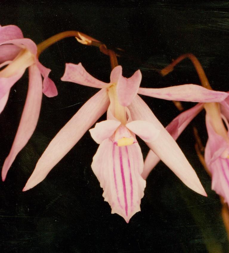 Found in Oaxaca on oaks at elevations around 1800 meters as a minature to small sized, cool growing epipbhyte with slender, fusiform pseudobulbs carrying 2 to 3, lanceolate, acute, gradullay narrowing below into the base leaves that blooms on a terminal, erect, racemose to paniculate?, 6 to 15" [15 to 37.5 cm] long, 10 to 12 flowered inflorescence with 3 to 4 flowers on each branch.