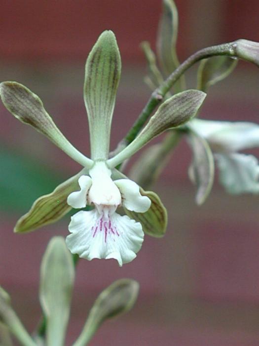 Found only on Andros Island in the Bahamas as a large sized, hot growing epiphyte occuring in high coppice habitats with a short, stout, creeping rhizome giving rise to crowded, ovoid pseudobulbs enveloped in youth by a few scarious sheaths and carrying 2, apical, suberect, coriaceous, rigid, linear-oblong, acute leaves that blooms in the spring on a terminal, distally several sheathed peduncle, rachis paniculate, spreading branched, to 24" [30 cm] long, laxly many flowered inflorescence with minute, ovate-triangular, obtuse to acute floral bracts.