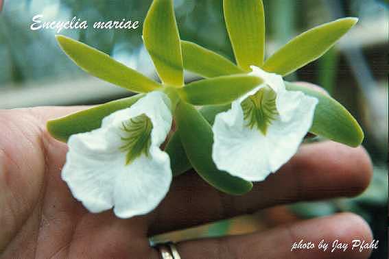References W3 Tropicos, Kew Monocot list , IPNI ; AOS Bulletin Vol 26 #8 1957 as Epidendrum mariae photo fide; AOS Bulletin Vol 29 No 6 1960; AOS Bulletin Vol 31 No 3 1962 as Epidendrum mariae photo fide; AOS Bulletin Vol 32 No 10 1963 as Epidendrum mariae; AOS Bulletin Vol 33 No 7 1964; Encyclopedia of Cultivated Orchids Hawkes 1965 as Epidendrum mariae; AOS Bulletin Vol 35 No 10 1966 as Epidendrum mariae; AOS Bulletin Vol 36 #2 1967 as Epidendrum mariae photo fide; AOS Bulletin Vol 36 #4 1967 as Epidendrum mariae; AOS Bulletin Vol 36 #12 1967 photo fide back cover ad; AOS Bulletin Vol 38 #4 1969 as Epidendrum mariaephoto fide; AOS Bulletin Vol 39 No 10 1970 as Epidendrum mariae photo fide; The Genus Encyclia in Mexico Dressler & Pollard 1974 as Encyclia mariae; Die Orchideen 3 Auflage Bd 1 Sonderabdruck aus Schlechter Lieferung 9 513 - 576 Brieger, Maatsch and Senghas 1977 as Hormidium mariae; AOS Bulletin Vol 48 No 9 1979 as Encyclia mariae photo fide; An Introdution to the Orchids of Mexico Wiard 1987 as Encyclia mariae photo fide; Manual of Cultivated Orchid Species Bechtel, Cribb, & Launert 1992 as Encyclia mariae drawing/photo fide; AOS Bulletin Vol 64 No 6 1995 as Encyclia mariae Photo fide; Orchid Digest Vol 60 #1 1996 as Encyclia mariae photo fide; *The Cattleyas and Their Relatives Vol V Withner 1998 photo fide; Australian Orchid Review Vol 65 No 6 2000 photo; Rudolf Schlechter Die Orchideen Band 1C lieferung 42 - 43 pg 2626 - 2762 Brieger 2001 photo fide; Icones Orchidacearum 5 & 6 Orchids Of Mexico Parts 2 & 3 Plate 584 Hagsater, Soto 2002 drawing fide; *The Cattleya and Their Relatives Vol 7 The Debateable Epidendrum Withner & Harding 2004; AOS Bulletin Vol 75 No 8 2006 photo fide; AOS Bulletin Vol 75 No 11 2006 as Prosthechea mariae photo fide; Mille et Une Mini Orchideees Roguenant 2009 as Prosthechea mariae photo fide; AOS Bulletin Vol 85 #8 2016 AS pROSTHECHEA MARIAEA photo fide; AOS Bulletin Vol 85 #10 2016 as Prosthechea mariae photo fide; AOS Bulletin Vol 85 #12 2016 as Encyclia mariae photo fide; AOS Bulletin Vol 88 #11 2019 as Prothechea mariaephoto fide;