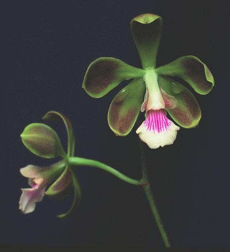Found in Para' state of northern Brazil in open Amazonian Forests at elevations of 50 to 400 meters as a small sized, hot growing epiphyte with ovate, green pseudobulbs enveloped in youth by deciduous, imbricating sheaths and carrying 1 to 2, apical, coriaceous, smooth, oblanceolate, subacute, gradually narrowing below into the clasping base leaves that blooms in the fall on a terminal, erect, to 7" [17.5 cm] long, to 5 flowered inflorescence.