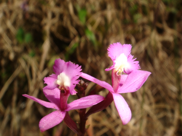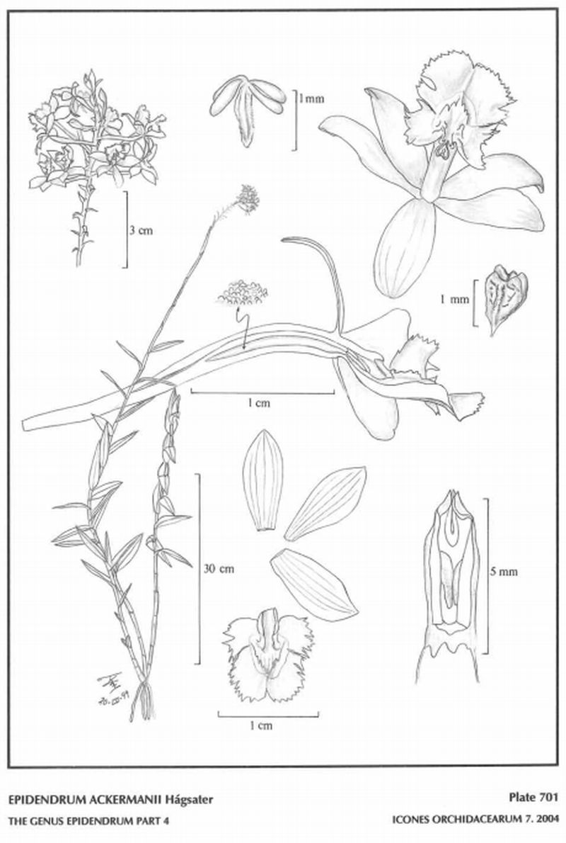 "Epidendrum ackermanii belongs to the GROUP Secundum SUBGROUP Secundum which is characerized by the caespitose habit, terete stems with several oblong-elliptic, acute to bilobed, distichous leaves, the scape elongate, with a short, apical raceme of successive, non-resupinate flowers, with a complicated, pluri-tuberculate callus. The species is recognized by the lanceolate, acute leaves, rhombic, straight, 5-veined petals, the elliptic, acute, straight, 5-veined sepals and the subquadrate lip in general outline, slightly longer than wide, the outline irregular dentate-laciniate, the lip formed by subequal, suborbicular lobes, the apical ones being somewhat larger; the flowers are pink, with a white blotch on the disc covering more than the callus. It resembles Epidendrum secundum Jacq. from the lesser Antillies which has smaller f1owers, the petals oblanceolate-cuneate, somewhat oblique and 3-veined, the sepals obliquely obovate, obtuse, 3-veined, with the lateral veins branching so as to appear 6-veined above, the lip trapezoid in outline, wlder than long, the margin deeply fimbriate, the lateral lobes larger than the apical lobes, the apical lobe widely flabellate, truncate. In the Greater Antillies it is vegetatively similar to Epidendrum wrightii Lindl. which has orange flowers, a deltate-ovate lip, V-shaped callus, prolonged into a central keel. It has been confused with Epidendrum anceps Jacq., which has lanceolate to obovate leaves of variable length, and a subcorymbose inflorescence with simultaneous purple-brown, fleshy flowers, and an ecallose lip with suborbicular lateral lobes, and entire margins." Hagsater etal 2004