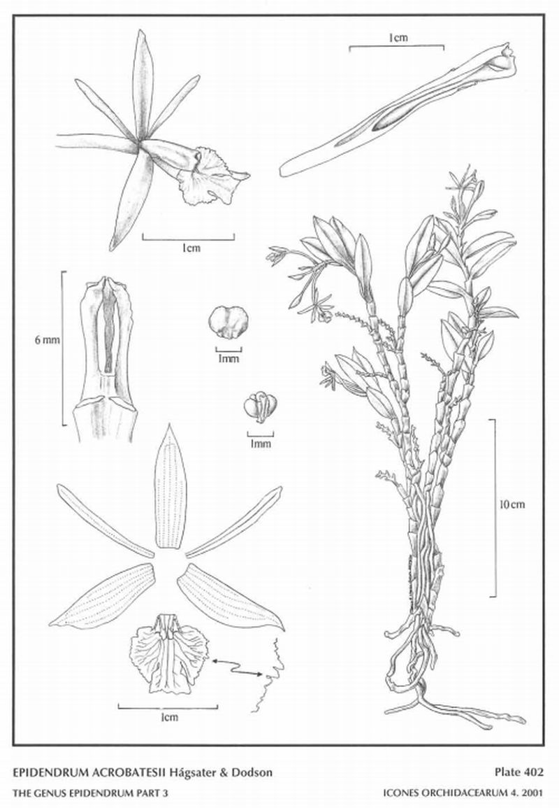 "Epidendrum acrobates belongs to the GROUP Batesii , characterized by the monopodial main stem with a subapical branching habit, acute leaves, successive, essentially non-resupinate flowers, opening one at a time, deep nectary, entire to 3-lobed lip with the lateral lobes more or less fimbriate to erose. The species appears at first sight to have the habit of a plant of the GROUP Andean SUBGROUP Moritzii, but it is recognized by its branching stem, elliptic-lanceolate, acute leaves, and a suberect peduncle and rachis, the successive flowers, one open at a time, the obcuneate midlobe of the lip and the large lateral lobes transversely semi-ovate, the apex acute. It is very close to E. batesii which has larger flowers, a more prominently inflated ovary, and ranges along the Pacific lowlands of southern Colombia and Ecuador at elevations of 250 to 600 meters" Hagsater etal 2001