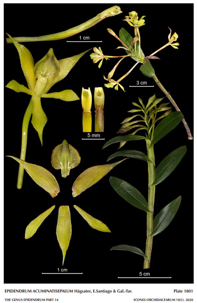 "Epidendrum acuminatisepalum belongs to the GROUP Andean SUBGROUP Vernixium which is characterized by the monopodial habit with sub-apical branching, erect inflorescences, laxly non-resupinate, spreading flowers, and the lip entire to 3-lobed and facing downwards. The new species is recognized by the leaves 1.46 to 2.12" x .48 to .6" [3.6 to 5.3 x 1.2 to 1.5 cm], narrowly elliptic, flowers yellow tinged red, ovary 1.12 to 1.56" [28 to 39 mm] long, sepals .6 to .668" [15 to 16.7 mm] long, long acuminate, the lip .32 x .312' [8.0 x 7.8 mm], entire, sub-orbicular with laminar calli and radiating thickened veins on the disc, and a fleshy thickened mid-rib. Epidendrum deorsus Hágsater & E.Santiago is endemic to central Peru and has leaves 1.04 to 5.2" x .8 to .12" [2.6 to 13 x 2.0 to 3.0 cm], oblong-elliptic, the flowers green turning ochre-yellow, the ovary 1.6" [40 mm] long, sepals .84 [21 mm] long, minutely apiculate, and the lip .4 x .4" [10 x 10 mm], cordiform with the calli sub-globose. Epidendrum decurviflorum Schltr. has leaves 1.2 to 2.2" x .04 to .048" [3.0 to 5.5 x 1.0 to 1.2 mm], lanceolate, flowers yellow, concolor, sepals .52 to .68" [13 to 16 mm] long with a low dorsal keel, and the lip .24 to .32" x .24 to .4" [6 to 8 x 6 to 10 mm], 3-lobed and lacking any thickened veins. Epidendrum scytocladium Schltr. has leaves .4 to 3.2" x .4 to .72" [1.0 to 8.0 x 1.0 to 1.8 cm], narrowly oblong to oblong-lanceolate, flowers yellow or greenish yellow with the lip marked with an intensely purple band around the disc, the ovary 1.2 to 1.68" [30 to 42 mm] long, sepals .48 to .56" [12 to 14 mm] long, and the lip somewhat 3-lobed with the base deeply cordate and the margin crenulate." Hagsater & Santiago 2020