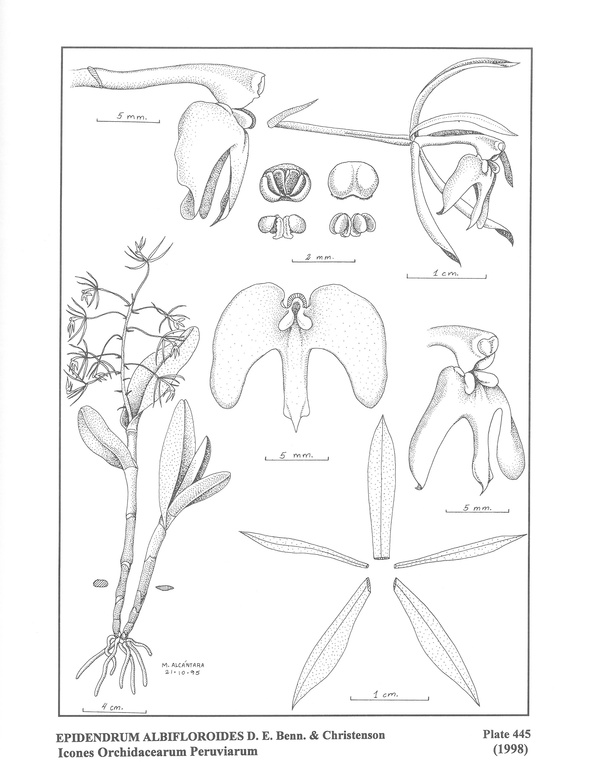 "Epidendrum albifloroides D.E.Benn. & Christenson belongs to the GROUP Ampelospathum which is characterized by the simple, cane-like, few leaved stems, with a single, tubular, tight spathaceous bract at the base of a racemose, simple, erect inflorescence, the flowers resupinate. The species is recognized by the elliptic leaves 3.2 x .832" [8.0 x 2.4 cm], apically rounded and unequally bilobed, lateral sepals .72" [18 mm] long, apex acute, petals .56" [14 mm] long, linear-oblanceolate, straight; lateral lobes of lip obliquely ovate, apex rounded, mid-lobe linear-oblong with apiculate apex, calli large, divaricate. Epidendrum aquilalatum is similar in every way but has leaves 5.8-8.0 x 2.8-3.5 cm, lateral sepals .76" [19 mm] long, acuminate, petals linear-oblanceolate and subfalcate, the whole spread lip appearing bird-like, the lateral lobes revolute, base deeply cordate, margin entire; lateral lobes obliquely semi-ovate, acute, the inner margin straight, the outer margin rounded; basal half of mid-lobe sub-quadrate forming an isthmus, apical half strongly dilated forming a pair of semi-orbicular, strongly divaricate lobes and ending in a prominent apiculus. Epidendrum ampliracemum has larger leaves 2.68 to 5.32" x 1.2 to 1.76" [6.7 to 13.3 x 3.0 to 4.4 cm], inflorescence densely many-flowered, 8" [20 cm] long, sepals .68 to .72" [17 to 18 mm] long, sub-acute, margin revolute, dorsal slightly reflexed, petals linear-oblanceolate, 1-veined, oblique, lip 3-lobed, lateral lobes dolabriform, mid-lobe sub-quadrate, apex minutely apiculate. Epidendrum chalmersii Hágsater & Ric.Fernández has smaller flowers, sepals .46 to .52" [11.5 to 13 mm] long, petals narrowly oblanceolate, 1-veined, lip 3-lobed, lateral lobes ovate-elliptic, mid-lobe rectangular-oblong, apex emarginate and bilobed. Epidendrum brevicallosum Hágsater & E.Santiago has leaves 1.8 to 3.2" x .6 to 1.08" [4.5 to 8.0 x 1.5 to 2.7 cm], elliptic, apically rounded, not bilobed, lateral sepals .6 to .64" [15 to 16 mm] long, apex obtuse, petals sub-spathulate, and lip with lateral lobes obliquely dolabriform, corners rounded and mid-lobe quadrate, apex emarginate." adapted from Plate 1705 Hagsater etal 2019
