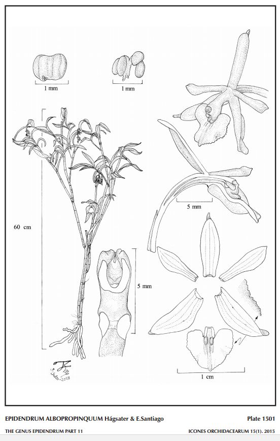 Epidendrum albopropinquum belongs to the GROUP Conopseum which is characterized by the sympodial growth mode, sometimes with branching stems, membranaceous to sub-coriaceous leaves, delicate, relatively small flowers, the lip bicallose, with few to many ribs on the disc of the lip, and the predominantly Mexican SUBGROUP Propinquum which is characterized by the bush-like habit with thin stems, membranaceous leaves, racemose, few flowered compact, inflorescence, and the mostly yellow or pale green flowers. Very similar to and historically lost among E propinquum but E albopropinquum differs mainly in the thin grass-like leaves, the ivory white color of the flowers and the strong hyancinth fragrance as E propinquum has pale green flowers and a very weak fragrance. It has been confused with E lignosum but it differs in the thicker, leathery leaves, apple green to greenish yellow flowers with the apex of the column and anther reddish to purple, and medicinally fragrant flowers. Epidendrum skutchii Ames, F.T.Hubb. & C.Schweinf. often has taller plants, to 48" [120 cm], with linear-lanceolate, acute, grass-like leaves, and apical inflorescence 1.8 to 2.4" [4.5 to 6 cm] long, with radiating, fleshy-thickened veins on the disc of the lip. Epidendrum eduardo-perezii Hágsater & E.Santiago has shorter plants with green flowers, sepals and petals tinged purple, the lip red-purple with multiple evident greenish ribs, column .32" [8 mm] long, green at base and purple at the apex, calli laminar and divergent. Hagsater etal 2015
