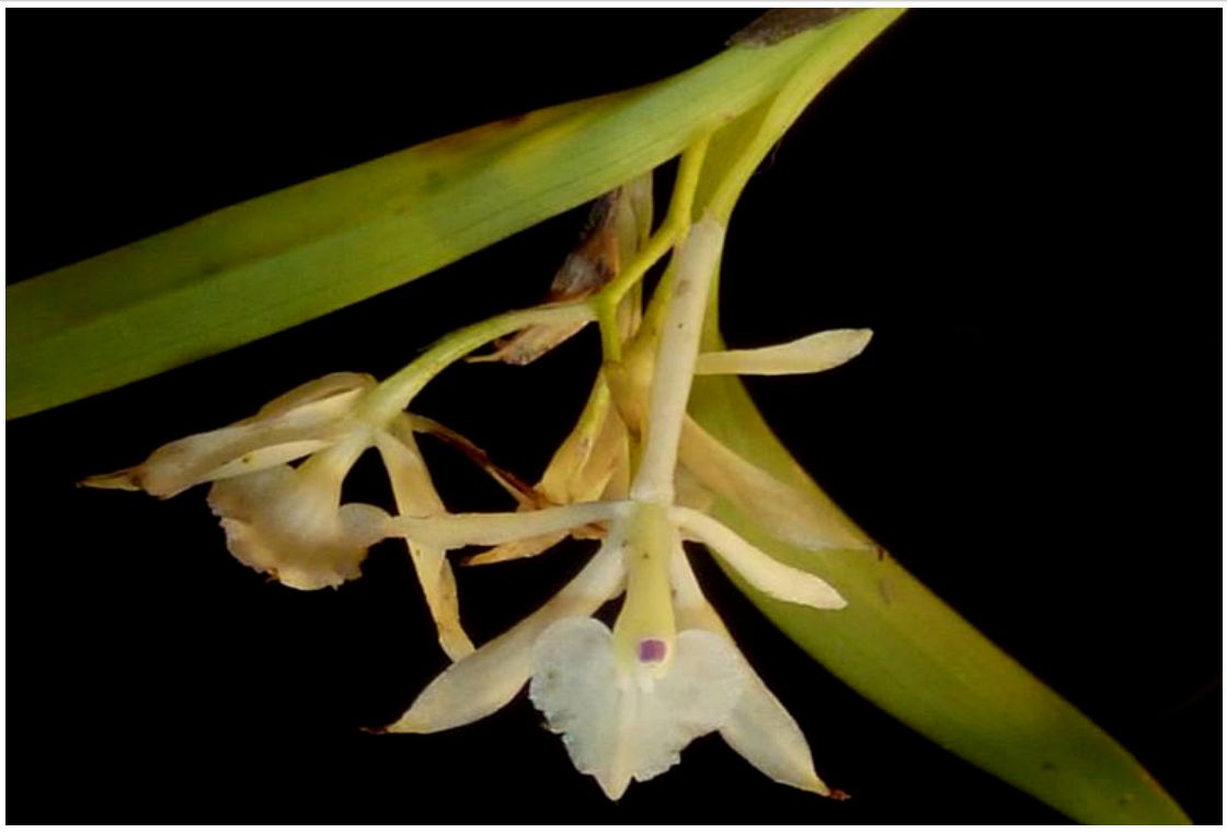 Found in southern Mexico, southern Guatemala and northern El Salvador in pine/oak or liquidambar forests at elevations around 1300 to 2000 meters as a medium sized, cool growing shrublike epiphyte with an erect, ascending primary stem with branches arising from the apical to subapical internodes just below the leaves that are thin, straight, unequal in size, carrying 2 to 4, carried towards the apex of the stem, articulate, alternate, similar in size, lanceolate, acute, thin, grass-like, dorsally carinate leaves that blooms in the earlier spring and summer on an apical, racemose, distichous, nutant, occurring only once, peduncle filiform, short, .44 to .68" [1.1 to 1.7 cm] long, bractless, rachis filiform, fractiflex, .52 to .8" [1.3 to 2 cm] long, laxly, simultaneously, 5 to 8 flowered inflorescence with much shorter than the ovary, triangular-filiform, long acuminate clasping floral bracts and carrying resupinate, ivory white, the apex of the column turining yellowish with age, sweetly strongly fragrant flowers.