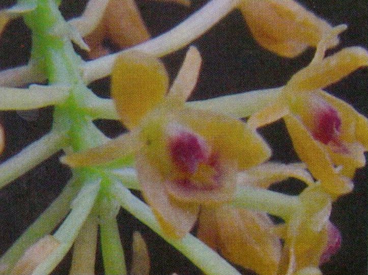 Found in Ecuador on sheer rock faces and in old trees at elevations around 2650 to 3100 meters as a medium sized, cold growing epiphyte or lithophyte with cane-like, terete, thin stems that give rise to new growths from the apical internode of the previous stem and carrying 6 to 16, all along the stem, the lower ones deciduous, subcoriaceous, suberect, linear-lanceolate, obtuse, bilobed, margin entire, smooth leaves that blooms in the late winter through late summer on a terminal occuring only once, racemose, terete, thin, sub-umbellate, somewhat arching, 1" [2.5 cm] long, many flowered inflorescence with two basal bracts similar to the, half as long as the ovary, narrowly triangular acute floral bracts and carrying 22 simultaneously opening, resupinate, spirally disposed on the rachis, orange-ochre colored flowers.