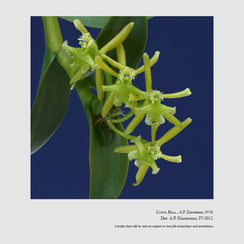 Found in Costa Rica in premontane wet forests at elevations around 1400 meters as a small sized, cool growing epiphyte with erect, simple, cane-like, terete, somewhat flattened stems carrying about 4 to 9, all along the stem, elliptic, obtuse, succulent, smooth, basally conduplicate leaves that blooms in the spring on a terminal, short, corymbose, 4 to 10, simultaneously flowered inflorescence with acute, much shorter than the ovary floral bracts.