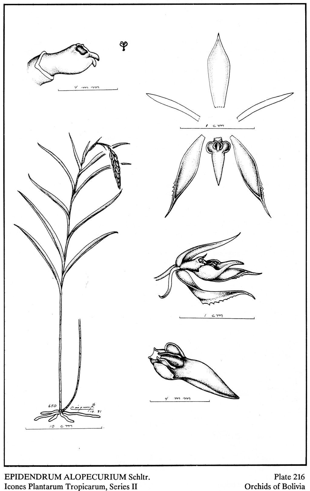 "Epidendrum alopecurum Schltr. from Bolivia, belongs to the GROUP Alpicolum SUBGROUP Alpicolum characterized by the simple, cane-like stems, long, narrow 1 ti 3 spathaceous bracts, fox-tail-like inflorescence and numerous flowers with fleshy lip. The species is recognized by the large inflorescence, with smaller flowers. Epidendrum alpiconigrense has terete stems, narrowly elliptic to lanceolate, acuminate leaves, small, white flowers, somewhat similar lobes of the lip, sinuate margin, unicallose lip, the calli prominent, fleshy and reduced clinandrium. Similar to Epidendrum zosterifolium but this has ancipitose stems, elliptic leaves, larger, greenish white flowers, with the middle near the apex of sepals and lip deep green, lobes of the lip unequal, margin entire, bicallose, midlobe about 3 times longer than wide, and the clinandrium erose and prominent. Epidendrum pucunoense Hágsater & Dodson has ancipitose stems, cream-yellow to white flowers, lobes of the lip entire, bicallose, the large orbicular lateral lobes, larger in area than the midlobe, emarginate, entire, prominent clinandrium." Adapted from Epidendrum alpiconigrense Icones 4 Plate 406 Hagsater etal 2001