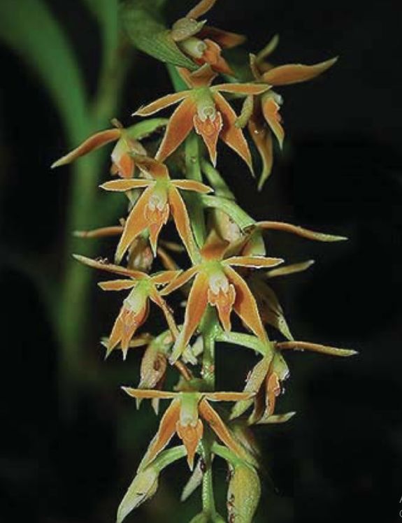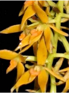 Found in Bolivia in montane cloud forests at elevations around 2300 meters as a medium sized, cold growing epiphyte with erect, terete, caespitose, cane-like stems carrying numerous, in the apical half, distichous, linear, acuminate leaves that blooms in the spring on a terminal, arching-pendent, basally sheathed, racemose, 2.8" [7 cm] long, densely many flowered inflorescence carrying orange flowers.