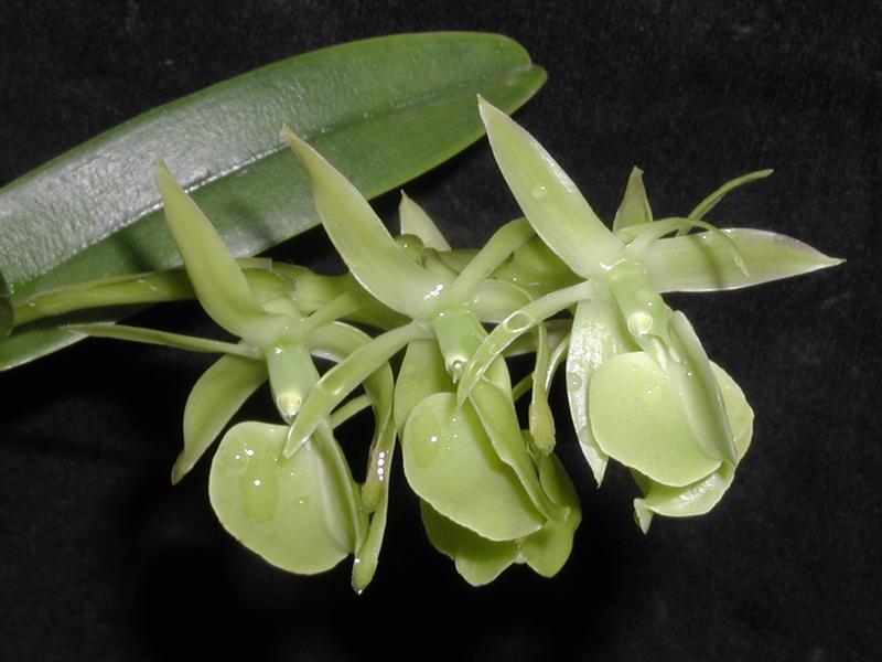 " Epidendrum alvarezdeltoroi belongs to the GROUP Spathiger SUBGROUP Coriifolium characterized by the sympodial habit, coriaceous leaves, and the racemose, distichous inflorescence carrying fleshy green to purplish flowers. The species is recognized by the short stems with 2 to 3 coriaceous leaves and the erect, distichous, inflorescence not surpassing the leaves, with large, distichous, secund, simultaneous flowers, the sepals .52 to .8" [14 to 20 mm] long, the rachis is ancipitose, zigzag and the bracts are not imbricating, nearly straight and narrowly rounded at the apex; it has a very strong seminal, pungent fragrance at night. Epidendrum coriifolium Lindl. has semiterete, fleshy leaves, the floral bracts arched inwards, and the inflorescence surpasses the apical leaf, the flowers have a brownish or purple hue. Epidendrum magnibracteatum Ames 1922 is distinguished by the acute floral bracts. Epidendrum beharorum Hágsater, endemic to Guatemala, has longer, much larger plants, to 18" [45 cm] tall, (spreading floral bracts .88" to 1.72" [22- 43 mm], and carries successive opening flowers." Hagsater etal 2001