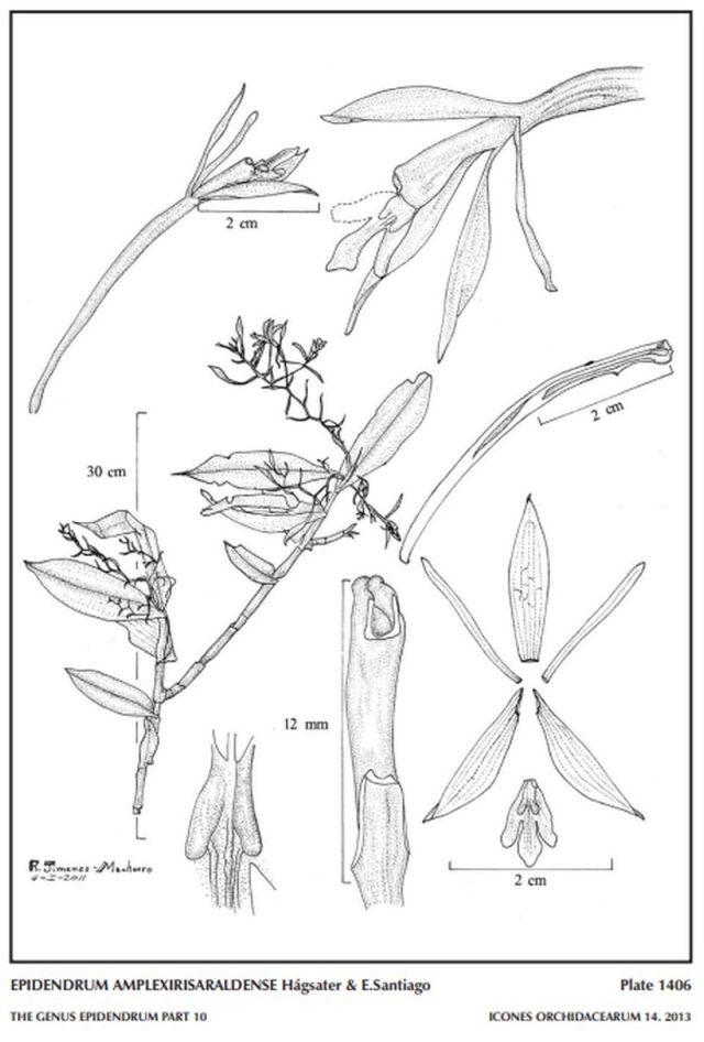 "Epidendrum amplexirisaraldense belongs to the GROUP Arbuscula which is characterized by the erect plants where the new stems originate from the apical internodes of the previous stem, and the SUBGROUP Amplexicaule which has short-acuminate leaves and lax, few-flowered, paniculate inflorescences with prominent floral bracts. The species is recognized by the lax, greenish flowers distributed along the flexuous rachis, the ovary does not form a vesicle, the cuneate base of the lip and the obliquely oblong lateral lobes of the lip. Epidendrum alexii Hágsater & Dodson is vegetatively similar but the flowers are white, the rachis straight, the ovary forms a minute vesicle just behind the perianth, the base of the lip is slightly cordate with the lateral lobes triangular-dolabriform and the margin erose. Epidendrum amplexicaule Lindl. has the flowers aggregate towards the apex of the rachis, a truncate base of the lip, sub-quadrate lateral lobes of the lip with the margin dentate and strongly divaricate with respect to the mid-lobe which is ob-deltate with the apex truncate." Hagsater etal 2013
