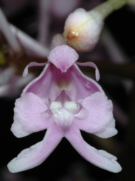 Found in Ecuador, Peru and Bolivia in wet montane forests on steep brush covered slopes at elevations of 1100 to 2000 meters as a giant sized, cool growing terrestrial reed stem orchid with erect, terete, cane-like stems enveloped by persistent leaf bearing sheaths and carrying many coriaceous, lanceolate, acute-acuminate, basally clasping leaves that as the plant matures are held more towards the apex and blooms in the late winter and spring on a terminal, paniculate, many branched, each branch 10"+ [25 cm+] and held in a single plane, many flowered inflorescence carrying pink, fragrant flowers.
