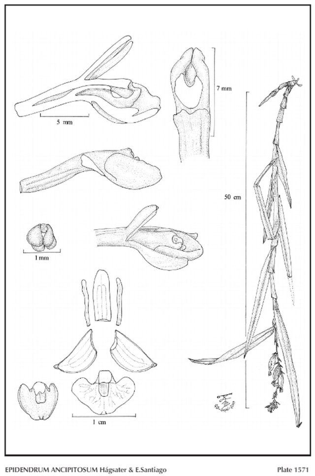 "Epidendrum ancipitosum belongs to the GROUP Ancipitosum which is recognized by the pendent, caespitose plant, ancipitose stems, with many narrow, long linear-lanceolate leaves, an apical racemose inflorescence, without spathes, the flowers pendent, resupinate, with linear petals, and widely cordiform lip, single callus, and devoid of any pilose hairs on either the disc of the lip nor the nectary. The species is recognized by the leaves up to 8" x .6" [20 x 1.5 cm], pendent, parallel to the stem, and the small flowers, sepals .328 to .348" [8.2-8.7 mm] long, the deeply and widely cordiform lip, embracing the column in natural position; with a single callus forming an oblong plate at the base of the lip. We have not been able to place this species in any of our prevously discussed groups within Epidendrum, though the flowers could be vaguely reminiscent of Epidendrum incapachychillum but that species has erect stems, an erect inflorescence, and the flowers are bright reddish orange to yellowish orange. The plants are somemwhat reminiscent of Epidendrum tandapianum Dodson & Hágsater, but in that species the stems are erect, and the leaves somewhat spreading, the inflorescence is both apical and lateral, producing successive flowers, the lip triangular, only slightly cordate at the base, spreading in natural position, and petals are comparatively wide, about half as wide as the sepals." Hagsater etal 2016