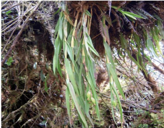 Found in Cusco Department of Peru in montane forests at elevations around 3883 meters as a medium sized, cold growing epiphyte with pendent, simple, cane-like, laterally compressed, ancipitose stems basally enveloped by long, tubilar, non-foliaceous, scarious sheaths and carrying 9, all along the stem, held parallel to the stem, partly imbricate, similar in size and shape, green, adaxial side lusterous, abaxial side glaucous, linear-lanceolate, acuminate, margin entire, slightly revolute leaves that blooms in the winter without a psathe, terminal, racemose, pendent, peduncle to .8" [2 cm] long, laterally compressed, thin, 1 to 3 bracted near the base, rachis to 4.8" [12 cm] long, laterally compressed, successivley to 20 flowered inflorescence with shorter than the ovary, lanceolate, acuminate, embracing, greenish brown floral bracts and carrying resupinate, pale green sepals and petals that are slightly tinged reddish brown.