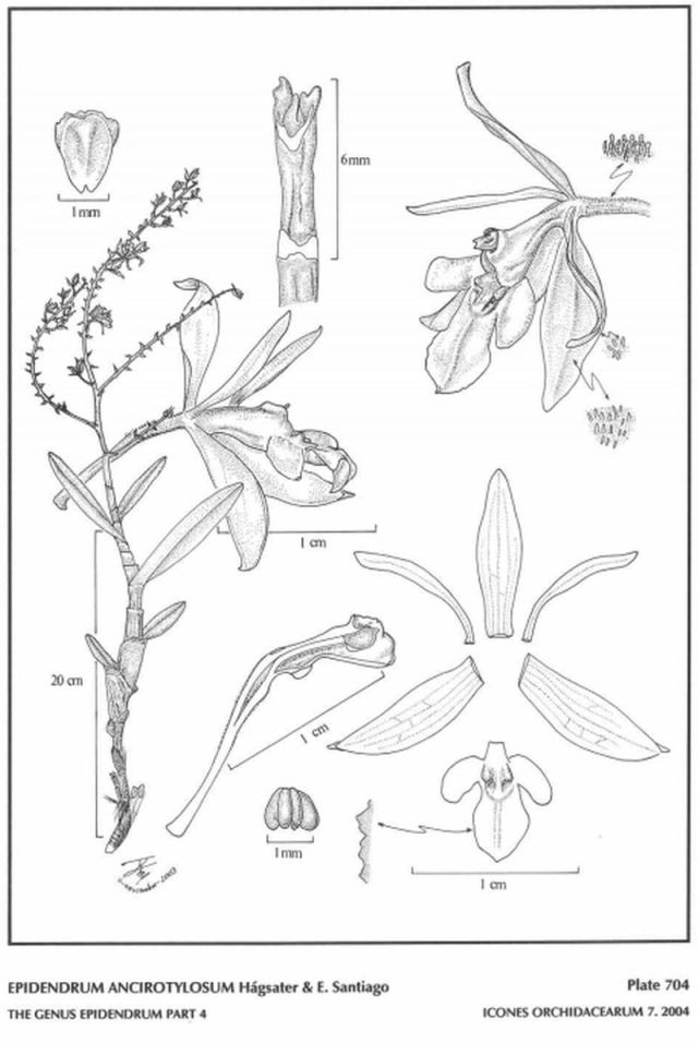 "Epidendrum ancirotylosum Hágsater & E.Santiago 2004 GROUP Amblostoma SUBGROUP Amblostomioides characterized by the caespitose habit, the thinly fusiform stems carrying narrow, apically bilobed, subcoriaceous leaves distributed towards the apical half of the stem that blooms on an often large, apical, erect, paniculate infloresence carrying greenish yellow to white flowers with a 3 lobed lip and with the ovaries and sepals usually dorsally pubescent. The species has short, thickened stems, an erect, relatively large, paniculate inflorescence, the rachis glabrous, heavy flowers, the ovaries pubescent, the sepals dorsally sparsely short-pubescent, petals linear, falcate, and the lip deeply 3-lobed, the lateral lobes obliquely oblong-reniform, the midlobe narrowly subrhombic, obtuse, bicallose, the calli with a cuniculus beneath them, and a semicircular, anchor-shaped structure in front. It is somewhat similar to Epidendrum pubiflorum C. Schweinf. which has the rachis finely pubescent, slightly larger flowers about as heavy looking, but the petals are .08" [2 mm] wide and the fip is bicallose and 3-keeled, the lateral lobes dolabriform and the midlobe cuneate, truncate. Epidendrum lanipes Lindl. has larger plants and flowers strongly fragrant of citrus, the rachis as well as the ovaries are pubescent, lateral lobes of the lip semiovate, midlobe cuneate, retuse, bicallose with three short keels in front." Hagsater etal 2004