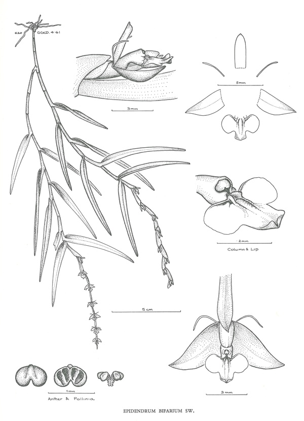 References W3 Tropicos, Kew Monocot list , IPNI ; Venezuelan Orchids Illustrated Vol 3 Dunsterville & Garay 1965 as E bifarium drawing fide; Orchids of Venezuela an Illustrated Field Guide Vol 1 Dunsterville & Garay 1979 as E bifarium drawing fide; *Orchids of Venezuela an Illustrated Field Guide Vol 3 for text/Vol 1 for drawing Romero & Carnevali 2000 Drawing fide; Orquideas Nativas del Tachira Fernandez 2003 photo fide; Orquideas, Tesoro de Colombia Vol 2 Ortiz & Uribe 2017 drawing fide;