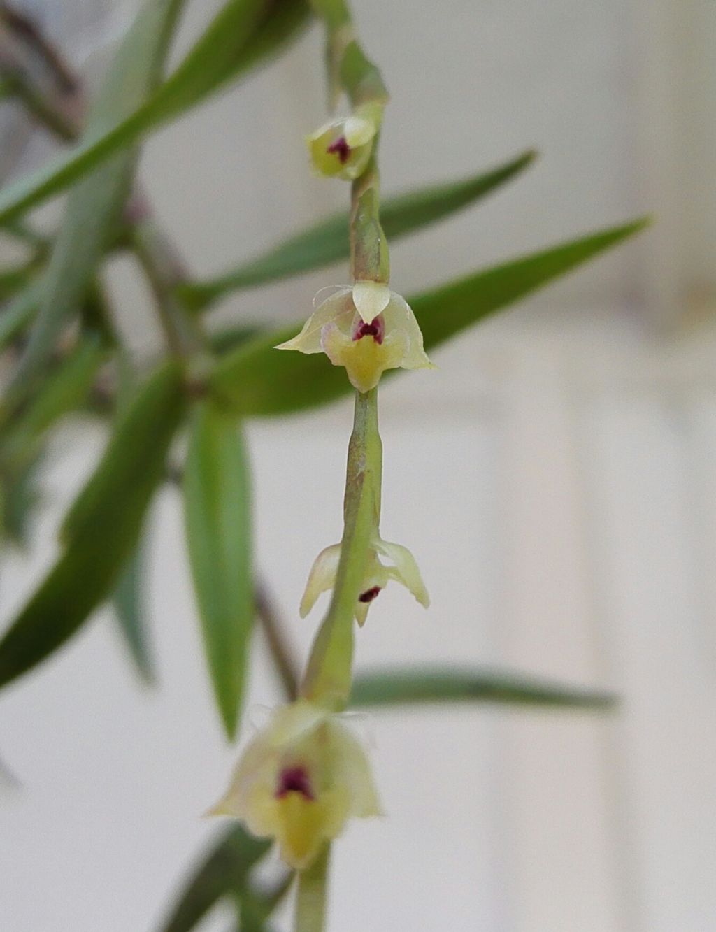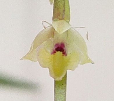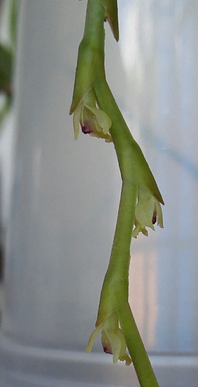 Found in northwestern Venezuela in montane, wet forests at elevations around 2100 to 2400 meters as a pendent, miniature sized, cold growing epiphyte with cane-like, branching from the near basal nodes of the previous stem, terete basally, laterally compressed towards the apex stems carrying, all along the stem, fleshy, linear, somewhat falcate, acute, basally clasping leaves that blooms in the winteron a terminal, racemose, pendent, 3" [7.5 cm] long including the very short peduncle enveloped by a spathe, rachis enveloped completely by highly compressed light green bracts, slightly flexuous, 7 to 8 flowered inflorescence which has minute white floral bracts that are also enveloped by the bracts.