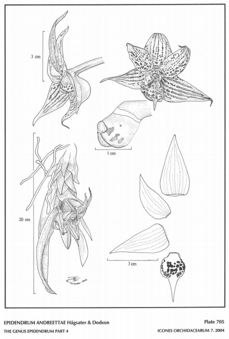 "Epidendrum andreettae belongs to the GROUP Kalopternix , characterized by the erect or pendant, 1 or 2-leaved pseudobulbs, glaucous leaves, resupinate flowers with a wide-trullate lip, the margin fleshy-erose. The species is recognized by the pendant habit, single, long leaves, the column geniculate with the ovary, at a 35 degree angle, and large flowers with acuminate segments, the petals 5-veined; the coloration of the segments is produced by dots in straight lines on the sepals, partially on the petals, and loosely covering the disc of the lip. It is vegetatively very similar to Epidendrum oxapampense Hágsater which has smaller flowers, acute floral segments and, the lip shortly apiculate, the petals 3-veined and the coloration of the flowers green with a single, large pink to maroon blotch on the lip. Epidendrum sophronitis Linden & Rchb.f. has an upright habit, a single cuneate, elliptic, acute leaf per pseudobulb, 1.48 x .6" [37 x 15 mm], and the acuminate sepals are .48 " [12 mm] long." Hagsater etal 2004