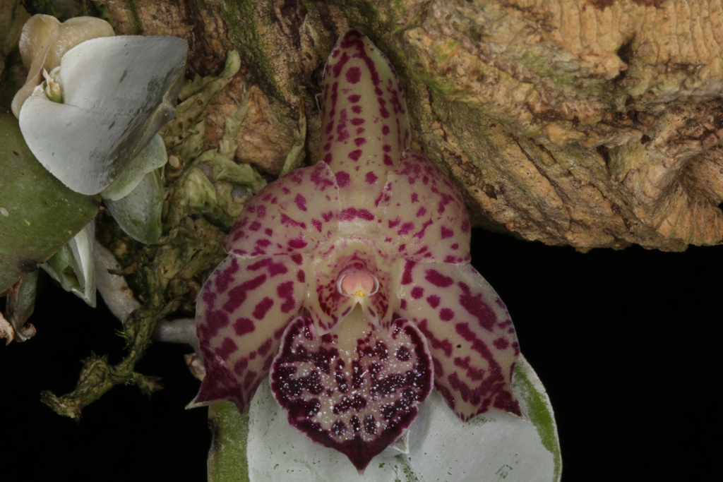 Found in Ecuador and Peru in cloud forests at higher elevations as a miniature sized, cold growing epiphyte with aggregate, short, simple stems enveloped completely by papery bracts and carrying 2, at the apex, alternate, pendent, coriaceous, glaucous blue-green, elliptic, subacute, margin entire leaves that blooms in the later spring on a terminal, occuring only once, racemose, pendent, sessile, 2.4" [6 cm] long, few flowered inflorescence carrying 2, simultaneously opening flowers,