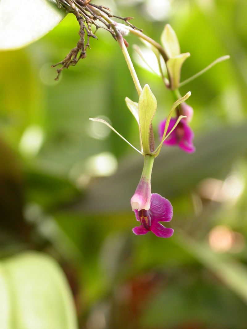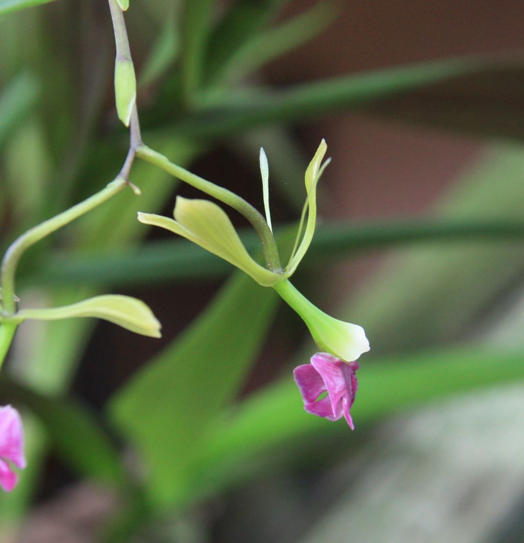 Found in Panama on both sides of the continental divide in wet montane forests near rivers and above dams at elevations around 70 to 800 meters as a small to medium sized, hot to warm growing epiphyte with a cane-like, erect, ancipitous stem mostly enveloped by scarious, tubular old leaf sheaths and carrying a few to several, elliptic-lanceolate, acuminate, grass-like, purple leaves that are basally clasping and blooms in the later summer on a terminal, erect then arching, 4" [10 cm] long, few flowered inflorescence that can rebloom for years and has simultaneous, non-fragrant, resupinate flowers.