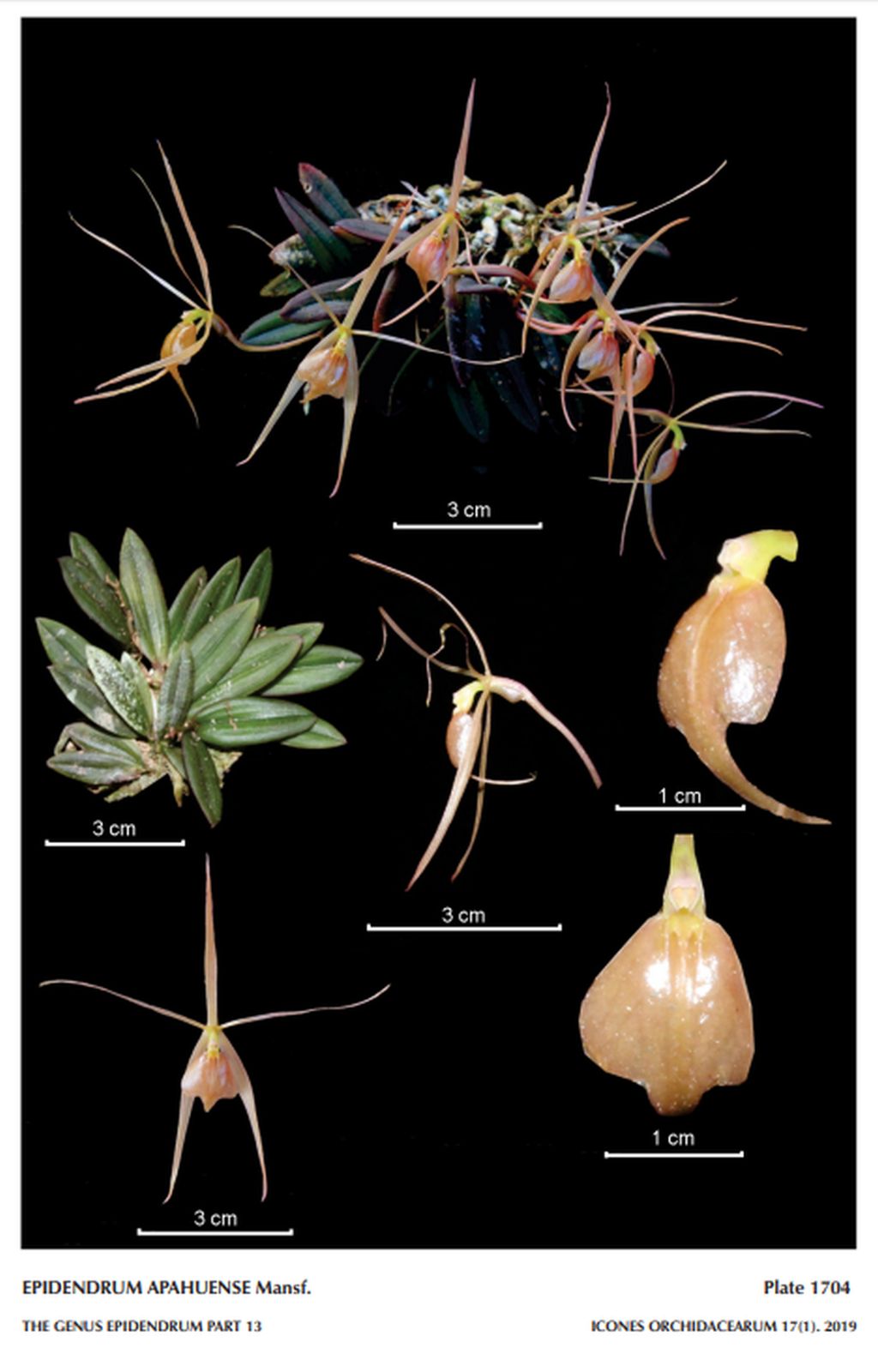 "Epidendrum apuahuense can be morphologically compared to species with pseudobulbs and star-shaped flowers within the GROUP Coilostylus as described by Hágsater (1985), which are more similar to E. hagsateri Christenson and E. volutum Lindl. & Paxton These two species have a reflexed lip, a feature also present E. apuahuense, but it can be easily distinguished from both species by its vegetative portion with much shorter leaves (up to 1.56" [3.9 cm] long vs. 2 to 8.4" [5 to 21 cm] long and shorter pseudobulbs up to .12" [0.3 cm] long vs. 1.6 to 6" [4 to 15 cm] long. The flowers are also useful to distinguish the species, and E. apuahuense can be recognized by its ventrally inflated cuniculus forming a nectary (vs. not inflated). Distribution is also a useful feature for distinguishing among species. Epidendrum volutum is known from Costa Rica and Panama, E. hagsateri is known only from Mexico, and E. apuahuense grows in the Amazon Basin. A phylogenetic reconstruction was performed using nuclear (ITS rDNA) and plastid (matK exon, rpl32- trnL spacer, trnL intron, and trnL-trnF spacer) datasets, aiming to clarify the generic placement of this taxon. Our results strongly support keeping E. apuahuense under Epidendrum (Klein et al. 2019)." Hagsater etal 2019