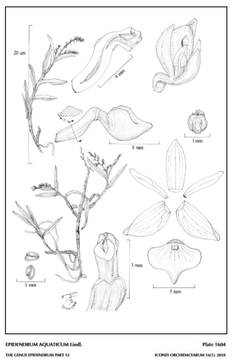 "Epidendrum aquaticum belongs to the GROUP Aquaticum which is characterized by the monopodial, branching habit, the distichous, erect to arching-nutant inflorescence, with fleshy flowers, and the disc of the lip and/or nectary often pilose. The species is recognized by the branching stems, branches 4 to 5" [10 to 12.5 cm] long, arching, leaves .52 to 2.04" [1.3 to 5.1 cm] x .16 to .24" [0.4 to 0.6 cm], lanceolate, glaucous below, inflorescence erect, distichous, simple to paniculate, flowers green, sepals .2 to .24" [5.0 to 6.0 mm] long, petals linear, .2 to .22" x .02 to .032" [5.0-5.5 mm x 0.5 to 0.8 mm], lip tri-lobed, base truncate, and callus rectangular with the apex truncate and slightly bilobed. Epidendrum dendrobioides Thunb. is also branching with branches 1.8 to 6.4" [4.5 to 16 cm] long, straight, sub-erect, leaves 1.4 to 2.4" x .2 to .32" [3.5 to 6.0 x 0.5 to 0.8 cm], linear-lanceolate, inflorescence distichous, generally simple, flowers ochre-yellow, sepals .24 to .3" [6.0 to 7.5 mm] long, petals linear-oblong, .22 to .24" x .4 to .48" [5.5 to 6.0 x 1.0 to 1.2 mm]. Epidendrum carnosum Lindl. also has branching stems, these about 6.4" [16 cm] long, sub-erect, straight, leaves 1.6 to 3.46" x .24 to .52" [4.0 to 8.6 x 0.6 to 1.3 cm], lanceolate, coriaceous and rigid, inflorescence generally paniculate, the branches sub-erect, flowers pale yellow to greenish yellow, sepals .36 to .4" [9.0 to 10 mm] long, petals lanceolate-rhombic, .32 to .36" x .06 to .1" [8.0 to 9.0 x 1.5 to 2.5 mm], and lip with a bidentate callus. Epidendrum pseudavicula Kraenzl. also has arching branches, but the leaves are .4 to 1.4" x .24 to .4" [1.0 to 3.5 x 0.6 to 1.0 cm], narrowly ovate to oblong-lanceolate, inflorescence simple to paniculate, flowers greenish yellow, sepals .2 to .24" [5 to 6 mm] long, and the base of the lip cuneate and bicallose, with a thin, short mid-rib in between." Hagsater etal 2018