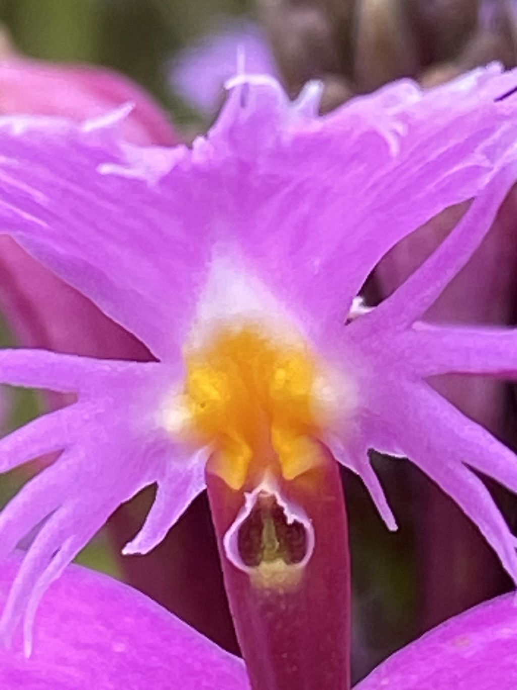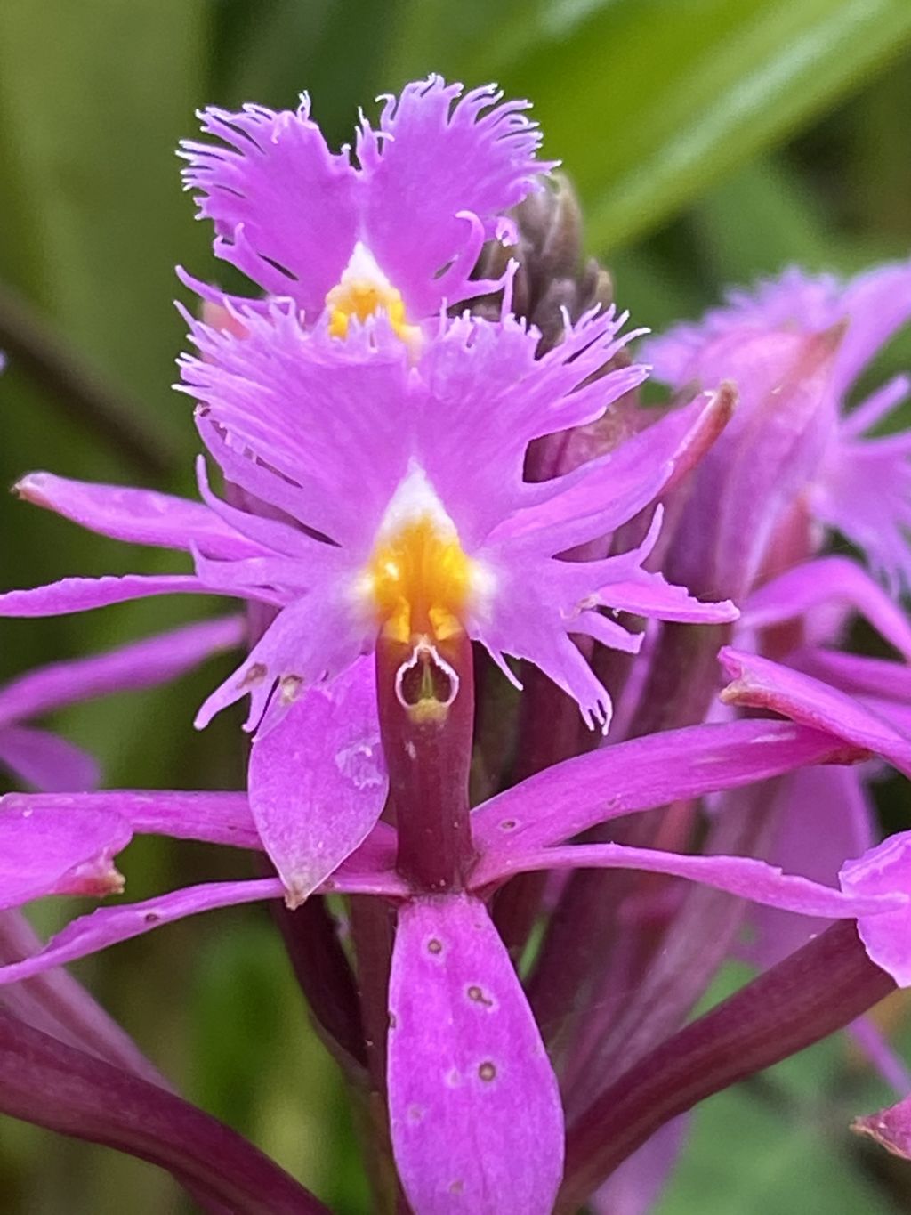 "Epidendrum arachnoglossum Rchb.f. is part of GROUP Secundum SUBGROUP Elongatum characterized by the complicated, tuberculose callus on the lip, with a low column, with an incumbent anther. The species a common species around Bogotá, has violet-crimson flowers, a many-lobed white and orange-yellow callus, and the deeply fringed lip forms a nearly entire, orbicular lamina, the base cordate." Plate 1486 Hagsater etal 2013