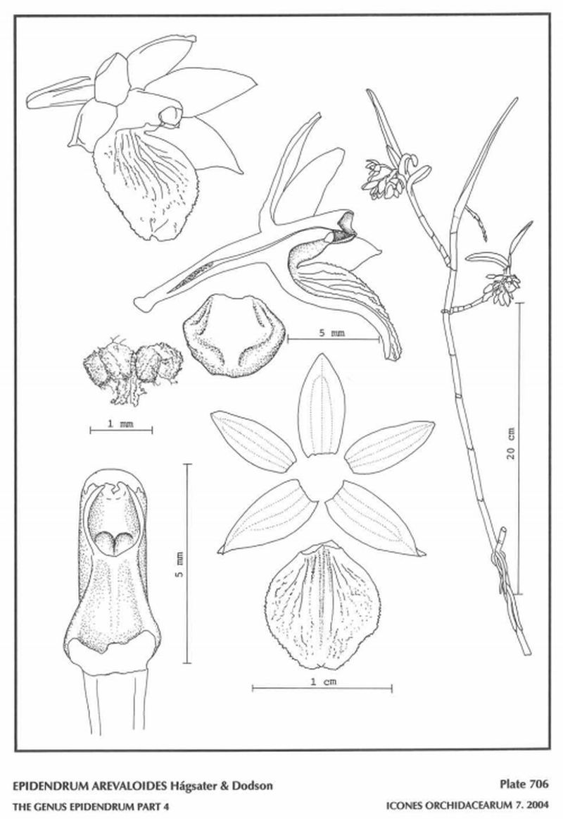 "Epidendrum arevaloides belongs to the GROUP Diothonea SUBGROUP Diothonea which is characterized by the branching plants, linear lanceolate to oblong, bilobed leaves, racemose, arching-nutant inflorescence, membranaceous flowers (rarely fleshy), the entire to 3-lobed, ecallose lip with the margin erose with or without 1 to 10 thin, smooth to erose keels, the column completely to obliquely united to the lip, the anther reniform. The new species is recognized by the thin, terete stems, branching towards the apex, short, arching inflorescence, narrowly lanceolate leaves distributed towards the apical half of the stems, obtuse petals .268 to .4" [6.7 to 10 mm] long, sepals 3-veined, lip ovate to suborbicular, ornamented with ancistrous trichomes on the apical half, thin, straight, free column with a pair of narrow lateral wings along the basal half; the column is .2 to .24" [5 to 6 mm] long. It is similar to Epidendrum arevaloi which has larger plants, longer leaves, the veins of the floral segments marked red, larger f1owers, the acute petals, the sepals .48 to .64" [12 to 16 mm] long, the lip provided with 9 to 10 keels evidently serrulate towards the apical half. Epidendrum cochabambanum Dodson & Vásquez has linear, conduplicate leaves .08 to .12" [2 to 3 mm] wide, smaller f1owers, narrowly linear-elliptic petals, the lip totally united to the column is provided with 5 laminar, smooth keels and the column thick and widening towards the apex. Epidendrum microdiothoneum Hágsater & Dodson has a glomerulate inflorescence, ventrally thickened ovary along the apical 2/3's, elliptic, petals 3-veined, the veins much branched, 3-lobed lip provided with 4 laminar keels, column short, .12" [3 mm] long. Epidendrum heterothoneum (Rchb. f. & Warsc.) Hágsater has larger f1owers, the floral segments .6 to .64" [15 to 16 mm] long, 3-lobed lip totally united to the column which is thick and widened towards the apex. Epidendrum megalospathum (Rchb. f.) Garay & Dunsterv., though belonging to a different group with a very different plant architecture and a promlnent spathe and has a similarly free column." Hagsater etal 2004