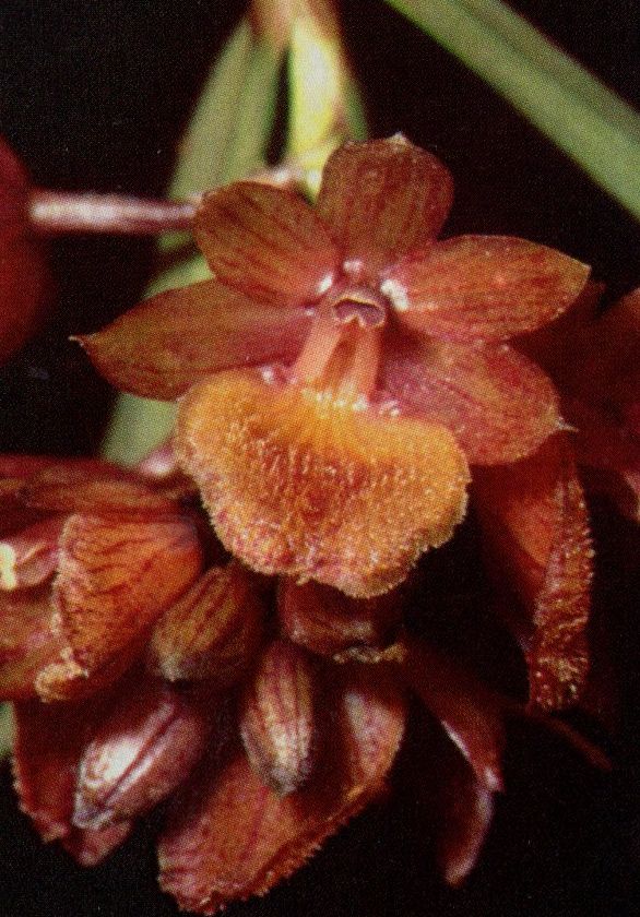 Found in Ecuador in wet montane forests at elevations of 1850 to 2780 meters as a medium sized, cool to cold growing epiphyte with erect, simple, cane-like, thin, terete stems producing new stems from the apical internode of the previous stem and carrying 4 to 9, on the apical 1/2 of the stem, narrowly lanceolate, bilobed to unequally bilobed, entire margin leaves that blooms in the fall on a terminal, racemose, erect to arching, occuring only once, terete, thin, .6" to 1.2" [1.5 to 3 cm] long, several to many flowered inflorescence with triangular, long-acuminate, as long as, to shorter than, the ovary floral bracts carrying 8 to 17, simultaneously opening, green to green-yellowish, reddish to rarely pinkish flowers.