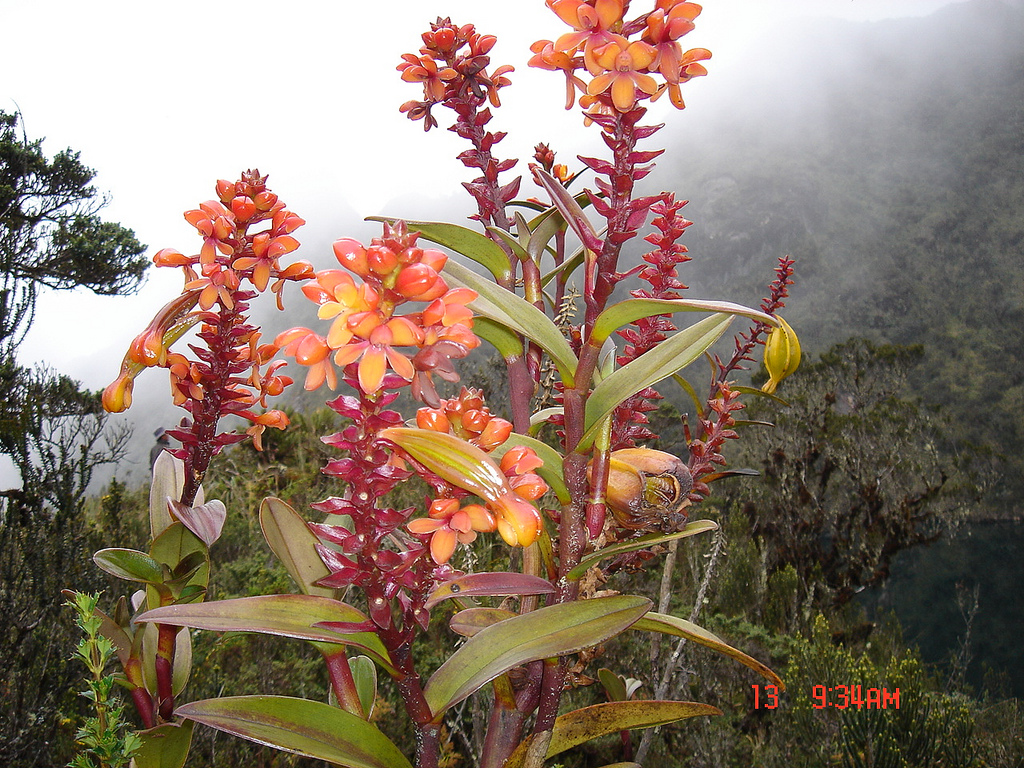 Found in central Ecuador in cloud forests at elevations of 3400 to 3700 meters as a giant sized, cold growing terrestrial with erect, branching when mature, cane-like, terete, shortly branching stems carrying 5 to 6, on the branches, along the apical 2/3's of the stem, alternate, spreading, lanceolate-elliptic, somewhat rounded apically, low dorsal keel, minutely crenulate marginally, articulate below into the base leaves that blooms in the spring through summer on a terminal, erect, occuring only once, racemose, short, thick inflorescence with the peduncle bractless and the rachis completely enveloped by prominent, half to nearly as long as the ovary, widely triangular-ovate, gradually smaller apically, spreading floral bracts and carrying to 45, resupinate, successsively opening, 3 to 6 open at a time, fleshy flowers.