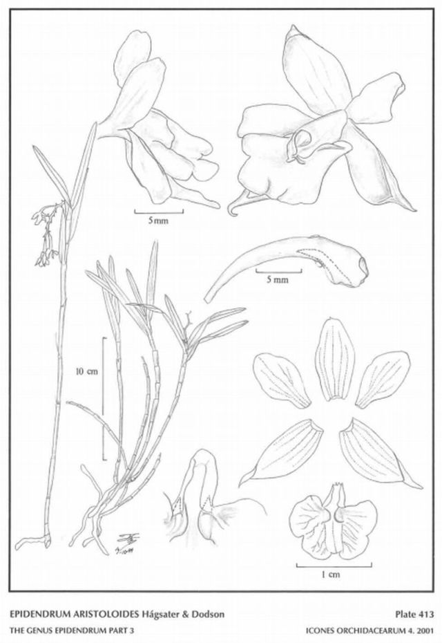 "Epidendrum aristoloides belongs to the GROUP Coronatum SUBGROUP Aristisepalum, which has a caespitose habit, simple stems, narrow, subcoriaceous leaves, a racemose inflorescence without spathes, and the sepals prominently aristate. Epidendrum aristoloides has a prominently 4-lobed lip, the lobes all semiorbicular, narrow leaves .2 to .32" [5 to 8 mm] wide, and .44 to .54" [11 to 13.5 mm] long sepals. It is closely allied to Epidendrum birostratum which has leaves up to .6" [15 mm] wide, the lip 3-lobed, the midlobe tridentate at the apex with a prominent 2-lobed callus and one keel, and sepals .52 to .68" [14 to 17 mm] long. Epidendrum aristisepalum has a 3-lobed, ecallose lip with 3 keels and the apical lobe rounded, the leaves .28 to .44" [7 to 11 mm] wide." Hagsater 2001