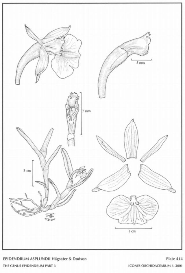 "Epidendrum asplundii belongs to the GROUP Difforme characterized by the caespitose, sympodial plants, fleshy, pale green to glaucous leaves, apical inflorescence, sessile, rarely with a short peduncle, one-flowered to many-flowered, and then corymbose, without spathaceous bracts, fleshy, green to yellowish-green rarely white flowers. The species can be recognized by the small but vigorous plants, ancipitose stems, ascending leaves, solitary flower, inflated ovary, 3-lobed lip with ovate lateral lobes and short, transversely rectangular midlobe with a minute mucro, and the prominent, tripartite, deeply dentate clinandrium. It is similar to E. chanchamayodifforme Hágsater & L. Sánchez from Peru, which has a more slender habit, narrower leaves, semicircular lateral lobes of the lip, disc of the lip with 3 prominent keels, midlobe of the lip without mucro, and an entire clinandrium. Epidendrum linearidifforme Hágsater & L. Sánchez, from French Guiana and Surinam, has terete stems, narrower leaves, longer flowers, a noninflated ovary, lateral lobes of the lip subquadrate, short, and an entire clinandrium. Epidendrum scharfii Hágsater & Dodson from Colombia and Ecuador has longer plants, terete stems, 3 to 4 flowers, reniform lip, and an entire clinandrium." Hagsater etal 2001