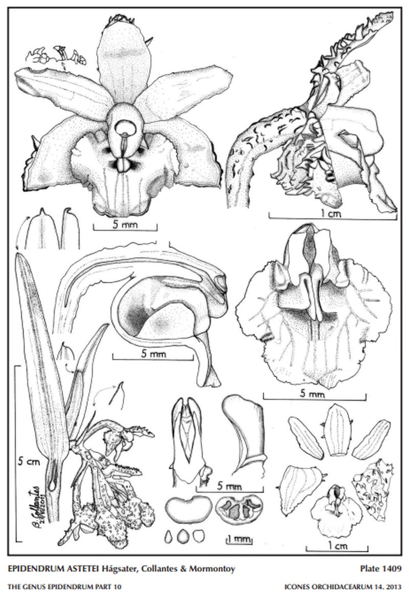 " Epidendrum astetei belongs to the GROUP Diothonea SUBGROUP Diothonea which is characterized by the branching plants, linear lanceolate to oblong, bilobed leaves, racemose, arching-nutant inflorescence, membranaceous flowers (rarely fleshy), the entire to 3-lobed, ecallose lip with the margin erose without or with 1 to 10 thin, smooth to erose ribs, the column completely to obliquely united to the lip, the anther reniform. The species is recognized by the sac-like, hemi-spherical base of the lip, the disc with two pairs of blade-like ribs, the anterior pair well developed, sigmoid-folded, with the inner (knees) edges intrusive in the stigmatic cavity, and the continuation bent at approximately 80°, becoming adnate laterally outwards; the anterior edges are visible from outside the flower as two contiguous calli bellow the apex of the column; in between, hidden, like a central brick is another hemi-cordate rib. Epidendrum trachypentatropis Hágsater & E.Santiago has small reddish flowers, dorsally muricate sepals .22 to .248" [5.5 to 5.7 mm] long, and the sack-like lip nearly totally united to the column, with 5 prominent, unequal, flat, laminar keels hidden below the column. Epidendrum trachysepalum Hágsater has up to 9 to 11, pale pink to yellowish brown flowers with wine-red veins, the sepals are strongly muricate, the lip totally free from the column and is adorned with 3 thin, ribs at the base of the lip, the lateral pair is “U” shaped, and the mid-rib only appears on the disc, so on the disc it appears to be 5-ribbed. Epidendrum cryptotropis Hágsater, Collantes & E.Santiago has yellowish green flowers with the edges of sepals and petals and the veins marked with purple, sepals .4 to .48" [10 to 12 mm] long, dorsally smooth, the lip entire, sub-pandurate. Epidendrum trachydipterum Hágsater, W.Nauray & E.Santiago has linear-lanceolate leaves 2.2 to 2.92" x .14 to .2" [5.5 to 7.3 x 0.35 to 0.5 cm], the inflorescence is lax and few flowered, petals linear and the lip has 5 laminar ribs." Hagsaer etal 2013