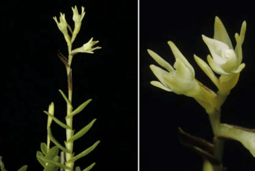 Found in Costa Rica and Panama at elevations around 500 to 1100 meters as a mini-miniature to miniature sized, warm to cool growing epiphyte with simple, arising from the 2 to 3" internode of the previous stem, cane-like, basally terete, laterally compressed above, thin, erect, straight stems carrying about 9 to 15, all along the stem, distichous, alternate, articulate, coriaceous, spreading horizontally , coriaceous, linear-lanceolate, obtuse, unequally bilobed, amplexicaul, basally clasping leaves that blooms in the late summer and fall on a terminal, occuring only once, racemose, distichous, secund, erect, .6 to 2.4" [1.5 to 6 cm] long including the .4 to 1.28" [1 to 3.2 cm] long, filiform peduncle, 2 to 7 flowered inflorescence with 1 to 2, tubular, acute bracts and shorter to slightly shorter than the ovary, narrowly ovate, acute, conduplicate, amplexicaul, slightly papillose floral bracts and carrying simultaneously opening, non-resupinate, distichous, pale green to greenish yellow flowers with a white anther.