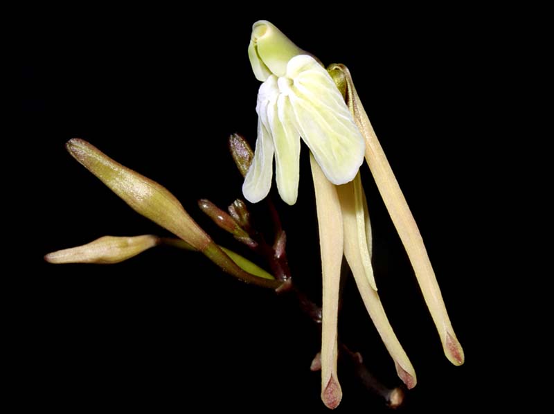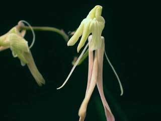 Found in southern Ecuador at elevations of 1500 to 1800 meters as a small sized, cool growing epiphyte with a simple, cane-like, ancipitous, sinuous stem carrying 2 to 4, on the upper half of the stem, alternate, coriaceous, smooth, ovate-elliptic, rounded, concave leaves that blooms in the fall on a terminal, racemose, successively single, few flowered, slighly arcuate inflorescence arising through a large tubular, ancipitous, acute, papyraeceous spathe and has to 10, resupinate, non-fragrant, droopy flowers.