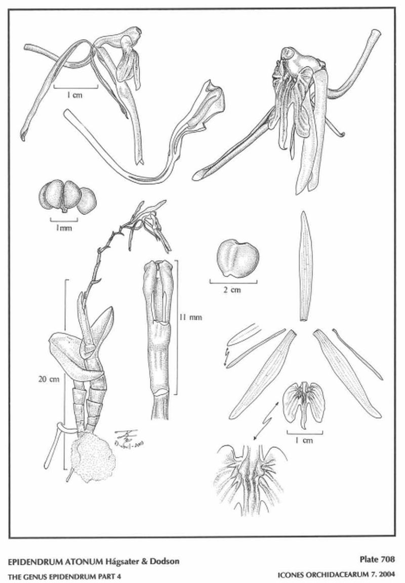 " Epidendrum atonum belongs to the 2004 GROUP Excisum SUBGROUP Leucochilum, characterized by the caespitose habit, erect stems with several fleshy leaves, a spathaceous bract, and the inflorescence with numerous star-like flowers, with narrow sepals and petals, and a prominent lip. The new species can be recognized by the short, ancipitose stems with roundish, amplexicaul, coriaceous leaves, the zigzag rachis with a single, successive flower, the pendulous sepals and petals and the deeply 3-lobed lip, with radiating, thickened keels. It is somewhat similar to Epidendrum dalstroemii which has tall, terete, cane-like stems, with a pair of elliptic-orbicular, coriaceous leaves, an erect, lax-flowered, racemose to paniculate inflorescence with large, simultaneous flowers, the petals much reduced, hair-like, and a suborbicular lip at the end of an upright, sigmoid column; the lonely spathaceous bract is small. It may also be close to Epidendrum nigricans Schltr. which has short, thickened stems with two oval, fleshy leaves, an erect, racemose to paniculate inflorescence subtended by a spathaceous bract, with successive flowers of somewhat similar characteristics." Hagsater etal 2004